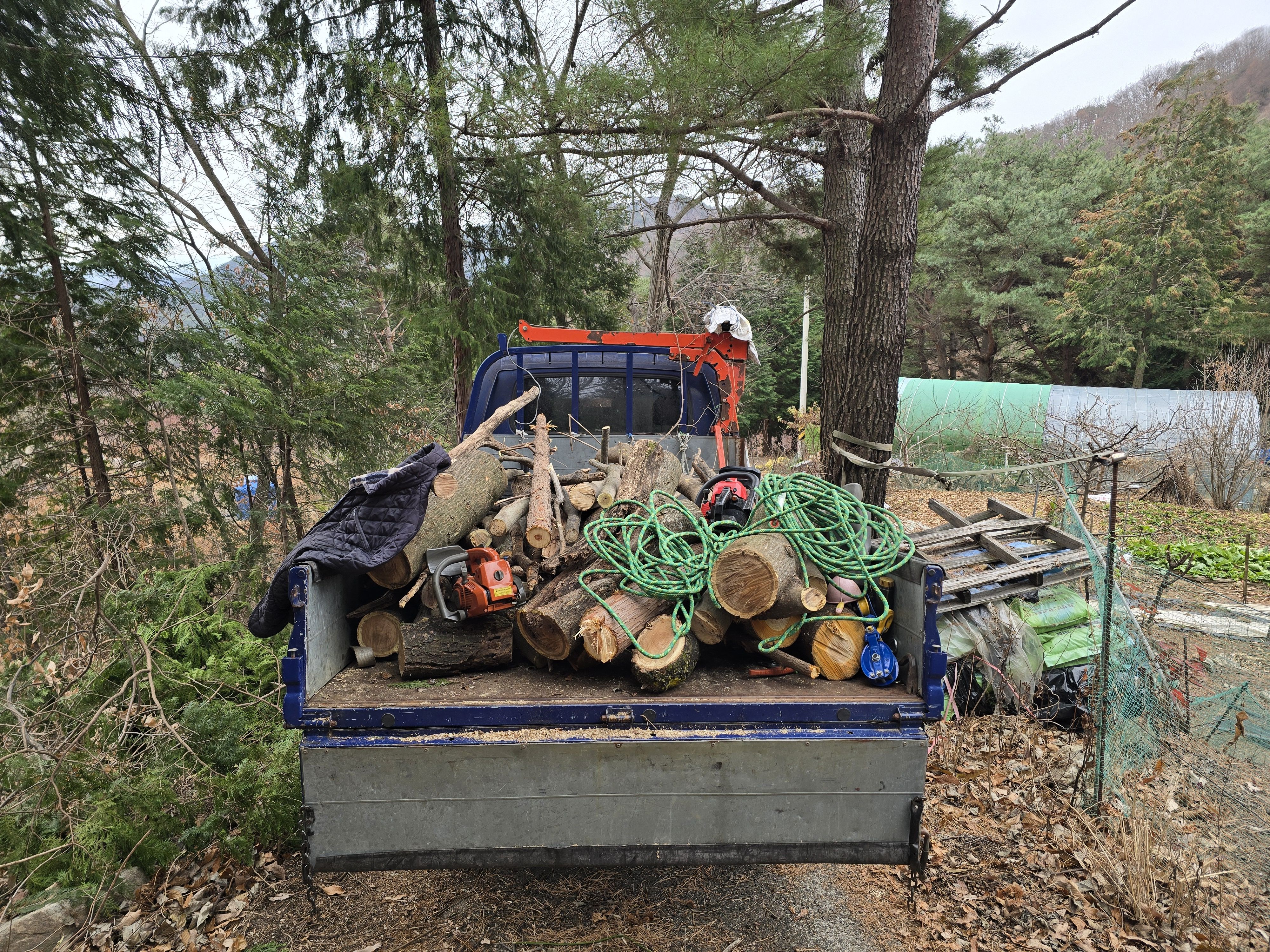 계곡 쪽에 잘라놓은 나무들을 옮겨놓기로 한다.