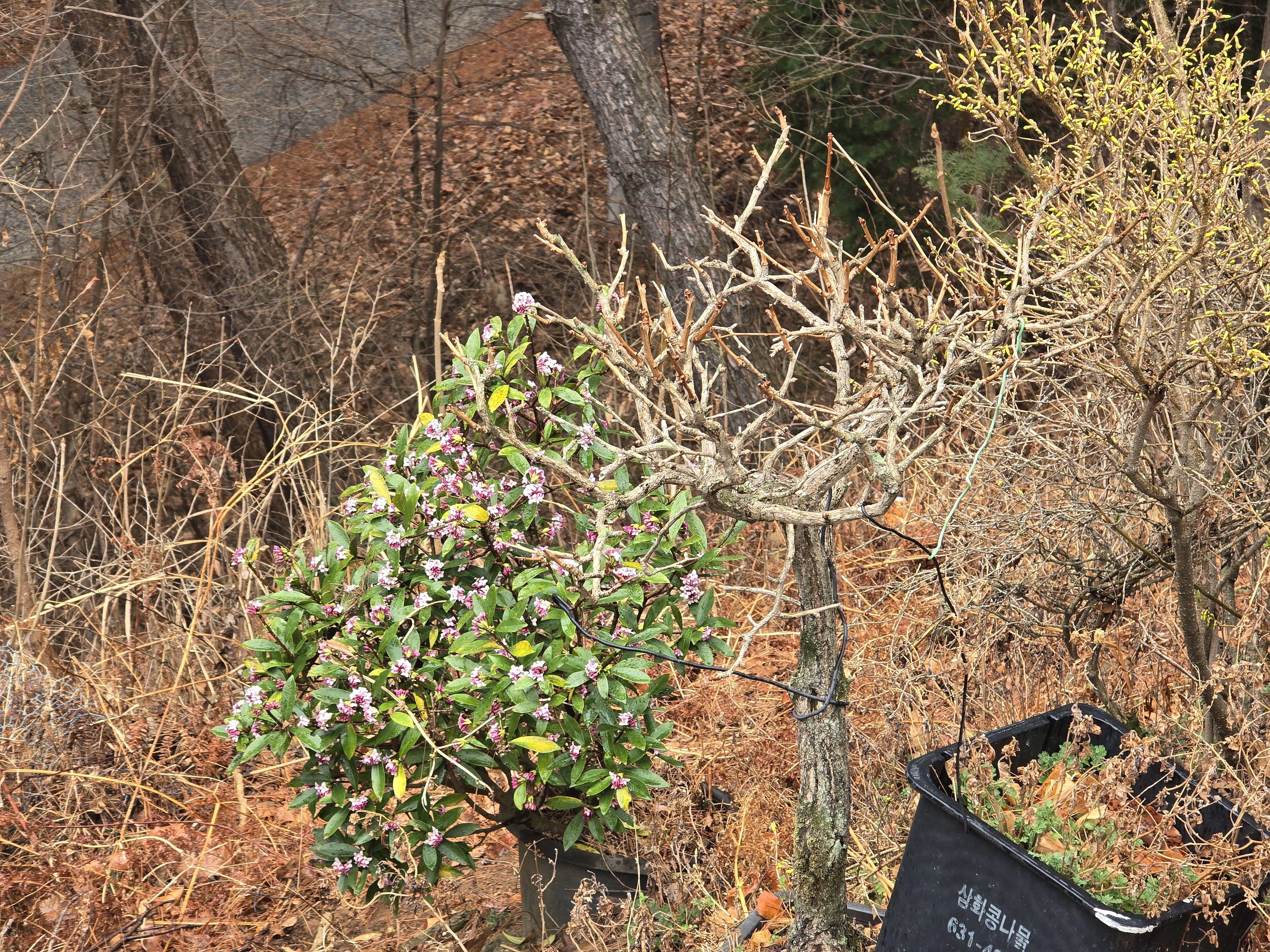 데크 아래쪽에 천리향이 꽃을 피우면서